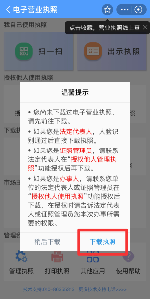 授权完成后,授权经办人需按照“1.电子营业执照下载”的提示,下载电子营业执照。